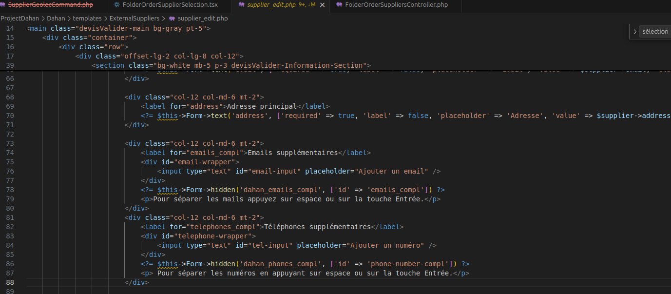 Pour assurer la synchronisation entre le formulaire et les données stockées, on a ajouté dans le formulaire CakePHP des champs cachés portant les noms reconnus par le backend au moment de la soumission. Par exemple : dahan_emails_compl et dahan_phones_compl.
