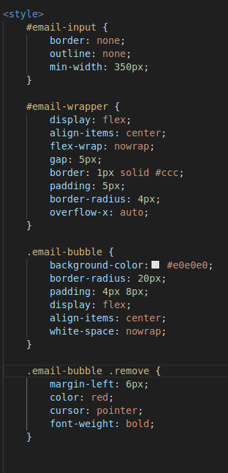 C’est ensuite le JavaScript qui vient lire les valeurs de ces champs cachés (souvent séparées par des points-virgules), pour les afficher à l’utilisateur sous forme de bulles dans un champ visible et interactif. Toute modification côté utilisateur est de nouveau retranscrite dans les champs cachés, assurant une synchronisation complète dans les deux sens.