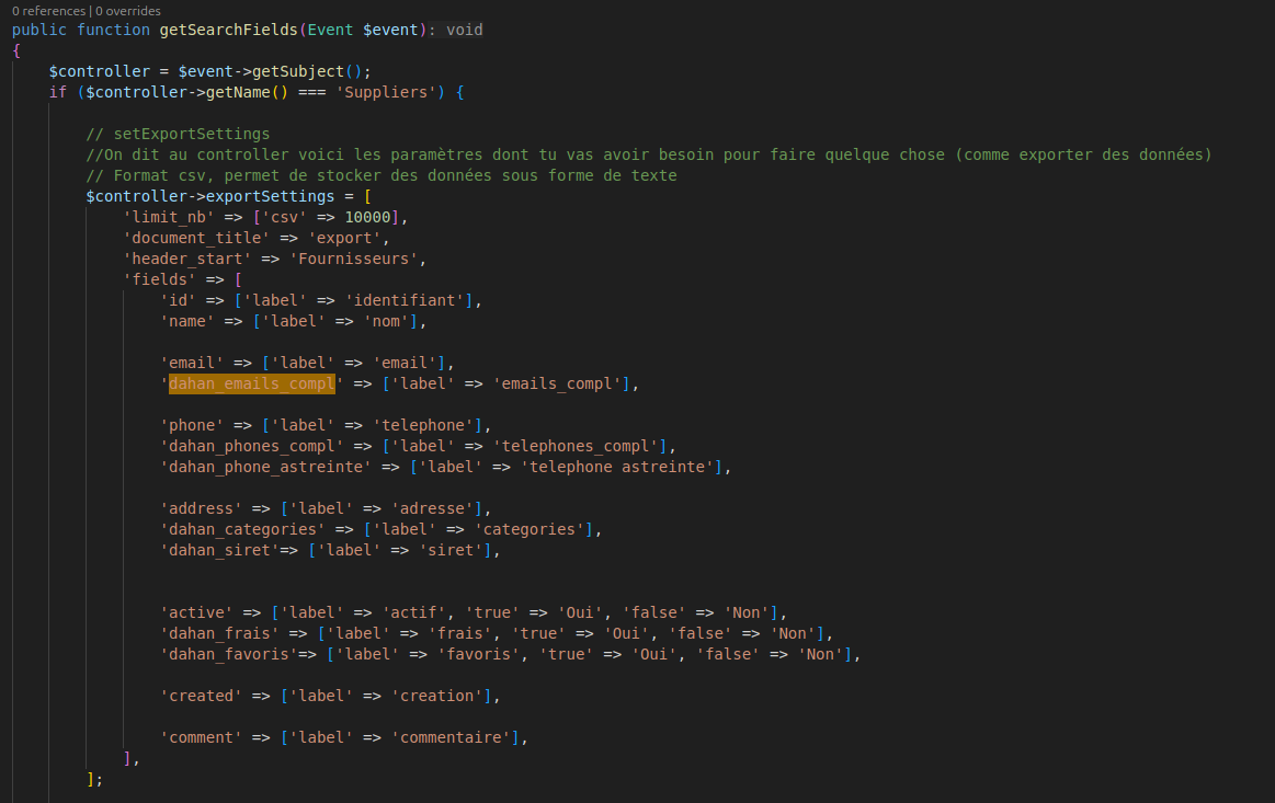 Ces champs servent à stocker les données au bon format pour les envoyer côté serveur (avec des ;). C’est dans le fichier SuppliersListener qu’on a ensuite précisé que ces champs devaient être exportés, c’est-à-dire pris en compte lors de l’enregistrement ou de la mise à jour des données du formulaire.