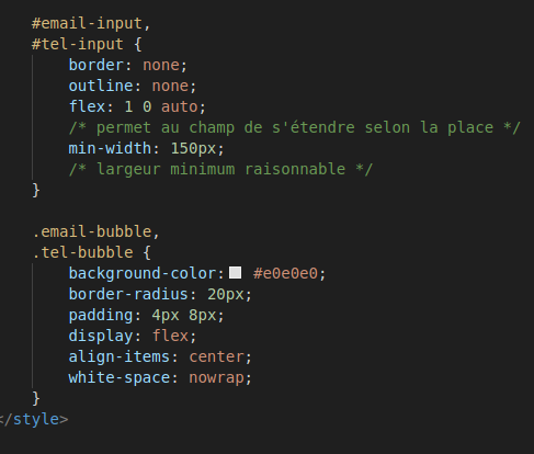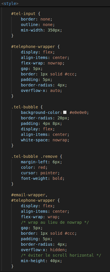 C’est ensuite le JavaScript qui vient lire les valeurs de ces champs cachés (souvent séparées par des points-virgules), pour les afficher à l’utilisateur sous forme de bulles dans un champ visible et interactif. Toute modification côté utilisateur est de nouveau retranscrite dans les champs cachés, assurant une synchronisation complète dans les deux sens.
