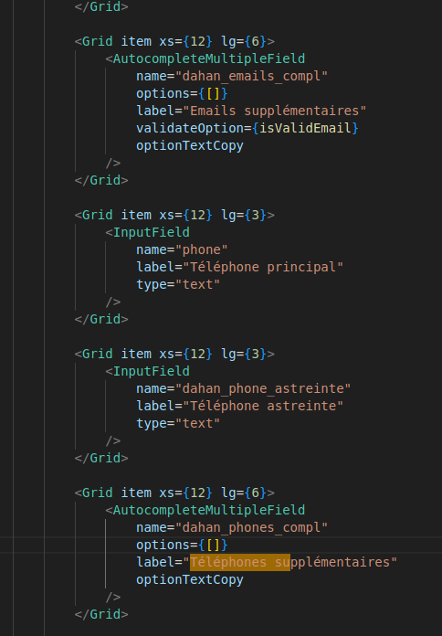 Du côté du formulaire React, chaque champ correspond à ces noms (ex. name="dahan_phones_compl"), ce qui permet une correspondance directe avec les champs cachés côté PHP. Ainsi, lors d’un enregistrement depuis React, les données sont bien enregistrées en base sous les bons noms — et inversement, lors d’un affichage depuis CakePHP, les valeurs stockées sont injectées dans les champs cachés.