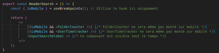 Pour adapter ce composant au responsive mobile, un hook personnalisé useBreakpoints() a été utilisé pour détecter si l’utilisateur est sur un appareil mobile (isMobile). FolderCounter et UserTimetracker ne sont pas affichés sur mobile : Ces deux composants sont rendus uniquement si isMobile est false, c’est-à-dire sur les écrans desktop.