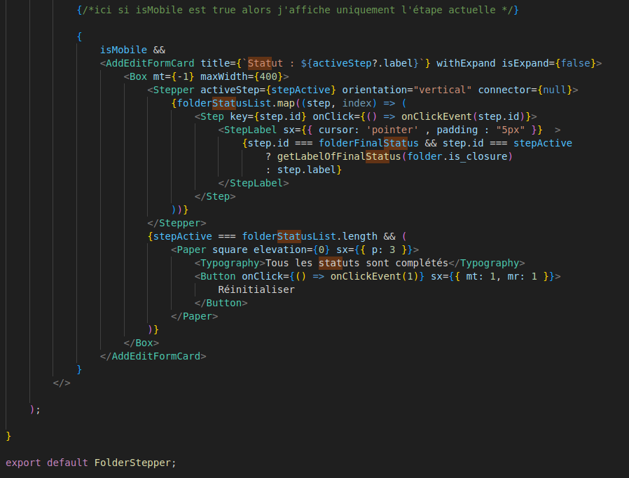 Dans cette tâche, j’ai dû réorganiser l’affichage du statut du dossier afin qu’il s’adapte correctement en version mobile. J’ai également ajusté plusieurs éléments de la page qui débordaient ou ne revenaient pas à la ligne comme prévu sur les petits écrans.